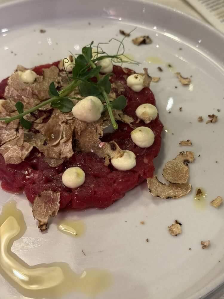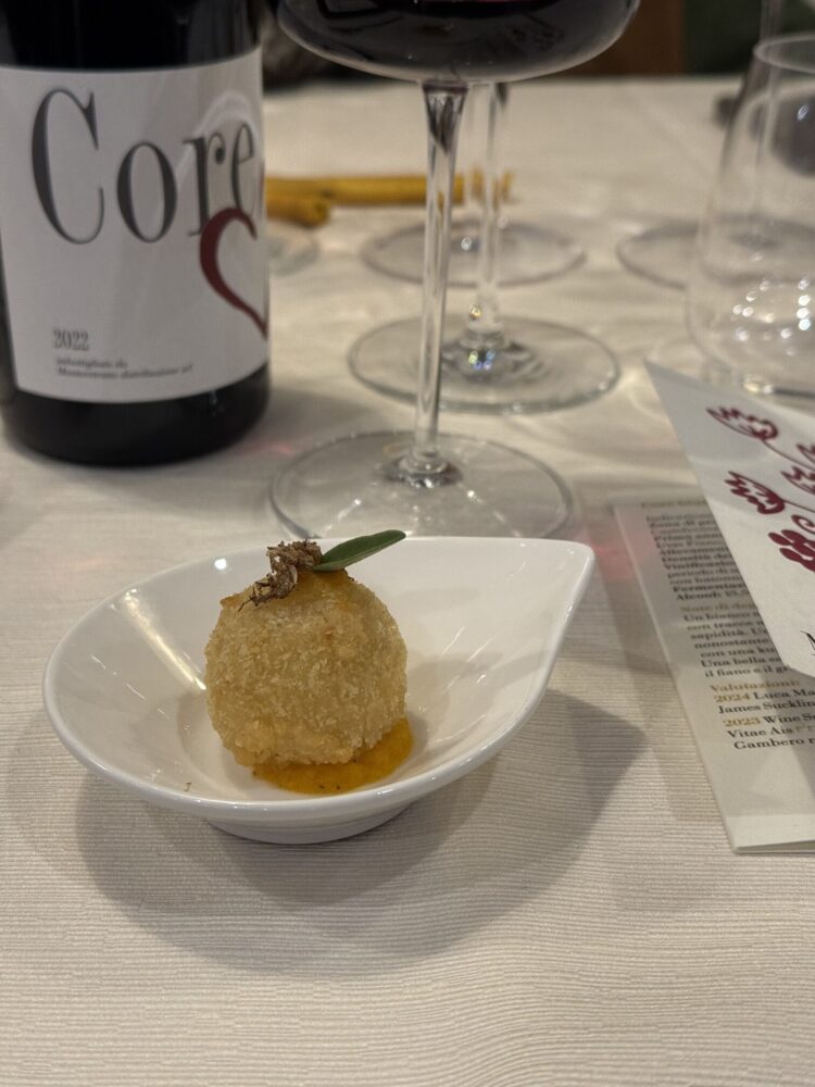 Nel calice il Core Rosso 2022 è luminoso e profondo, con profumi di amarena, violetta e spezia sottile. Si muove con agilità, accompagna i primi piatti con equilibrio e ritmo. Il bon bon di patate ripieno di provola, gel di zucca e tartufo bianco apre il bosco in tavola, il vino lo segue con passo leggero, bilanciando dolcezza e calore. Poi la battuta di manzo con uovo di quaglia a 62°, gel di provolone e tartufo bianco porta la serata su toni più decisi, con il vino che ritrova in questo piatto la sua struttura naturale e una freschezza che dà respiro al palato.