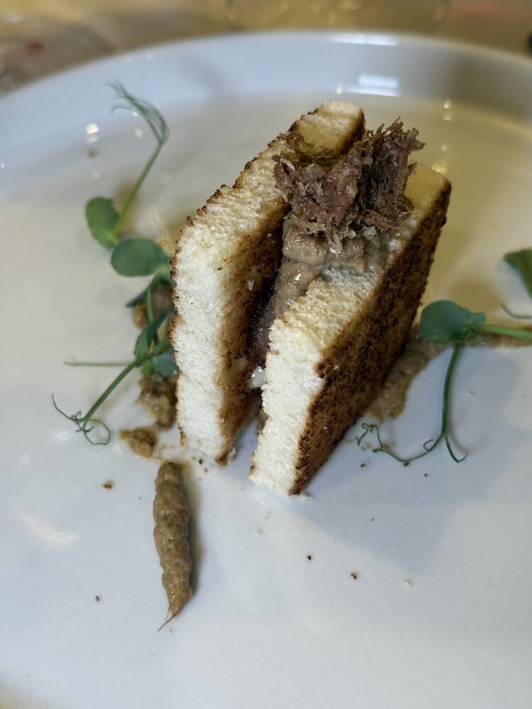 Il Japan sandwich con Wagyu A5 scottato, funghi porcini, maionese di casa e tartufo bianco segna il passaggio al Montevetrano 2020, blend di Cabernet Sauvignon, Aglianico e Merlot affinato in barrique per 14 mesi. Nel calice si apre un vino giovane ma già compiuto, intenso di ciliegia nera e prugna, con note balsamiche e minerali. La carne ne amplifica la forza, i porcini richiamano il bosco, il tartufo completa la tavolozza aromatica. È un abbinamento di precisione, costruito per consonanza, dove densità ed eleganza si rincorrono senza mai sovrapporsi.