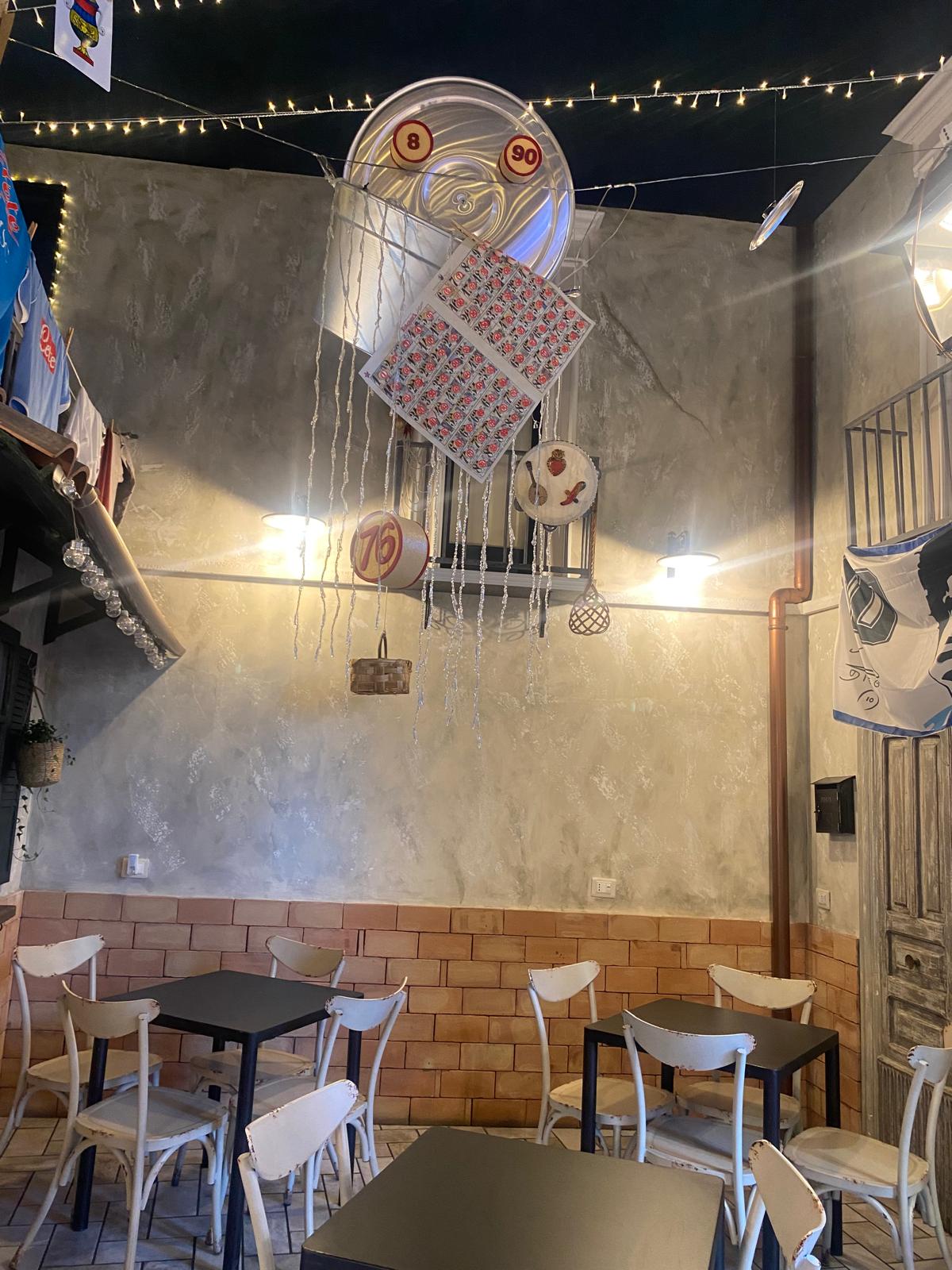 Gli arredi ricordano le atmosfere del ventre di Napoli, i panni stesi al balcone, le collane di aglio e peperoncino, gli oggetti scaramantici, i numeri della Smorfia, l’immancabile ‘panaro’ mentre, accanto, il vano più piccolo riproduce una vecchia cucina, quella della nonna per intenderci, corredata da stufa a legna, tavoli con sedie vintage volutamente spaiate e pentole di rame. Nulla di posticcio, ma in linea con il pensiero di Giuseppe che a Napoli ha lasciato il cuore già dai tempi dell’università, rapito (anche) dal profumo della pizza fritta che inondava Spaccanapoli a tutte le ore.
