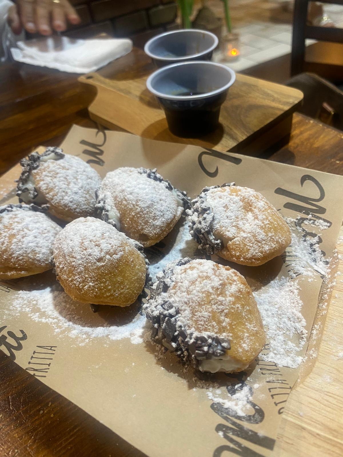 Per dessert niente di preconfezionato, né banali e stucchevoli monoporzioni eccessivamente zuccherine, dolci che, d’altronde, sarebbero del tutto decontestualizzati, ma solo straccetti di pasta di pizza impreziositi da finissima crema al cioccolato fondente o al latte e bombette alla crema di ricotta.