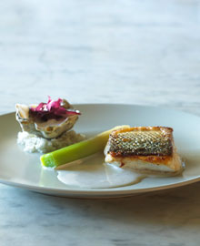 Secondo piatto di pesce: bar de ligne cuit à la vapeur, tartare d’huître et crème iodée réduite au Fuie Femme et moutarde de Crèmone: niente a che vedere con la nostra spigola, il gusto pieno del pesce abbinato al forte sapore dell’ostrica e alla crema iodata fanno di questo piatto uno dei migliori della serata.