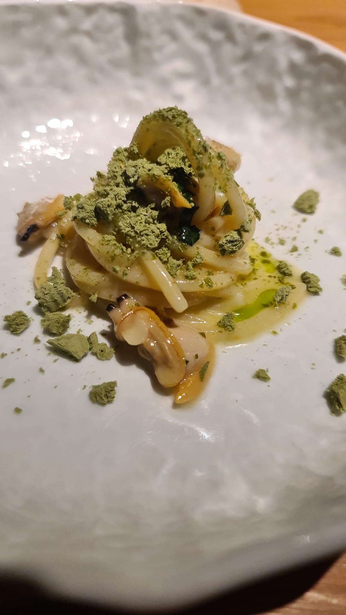 Seguito da: sorpresa! Fusilloro Verrigni con il cuore del piccione e raguse, finocchietto e tofu di mandorla, dove non si avverte l’intensità della frattaglia per il perfetto amalgama degli elementi. Davvero un piatto superbo.