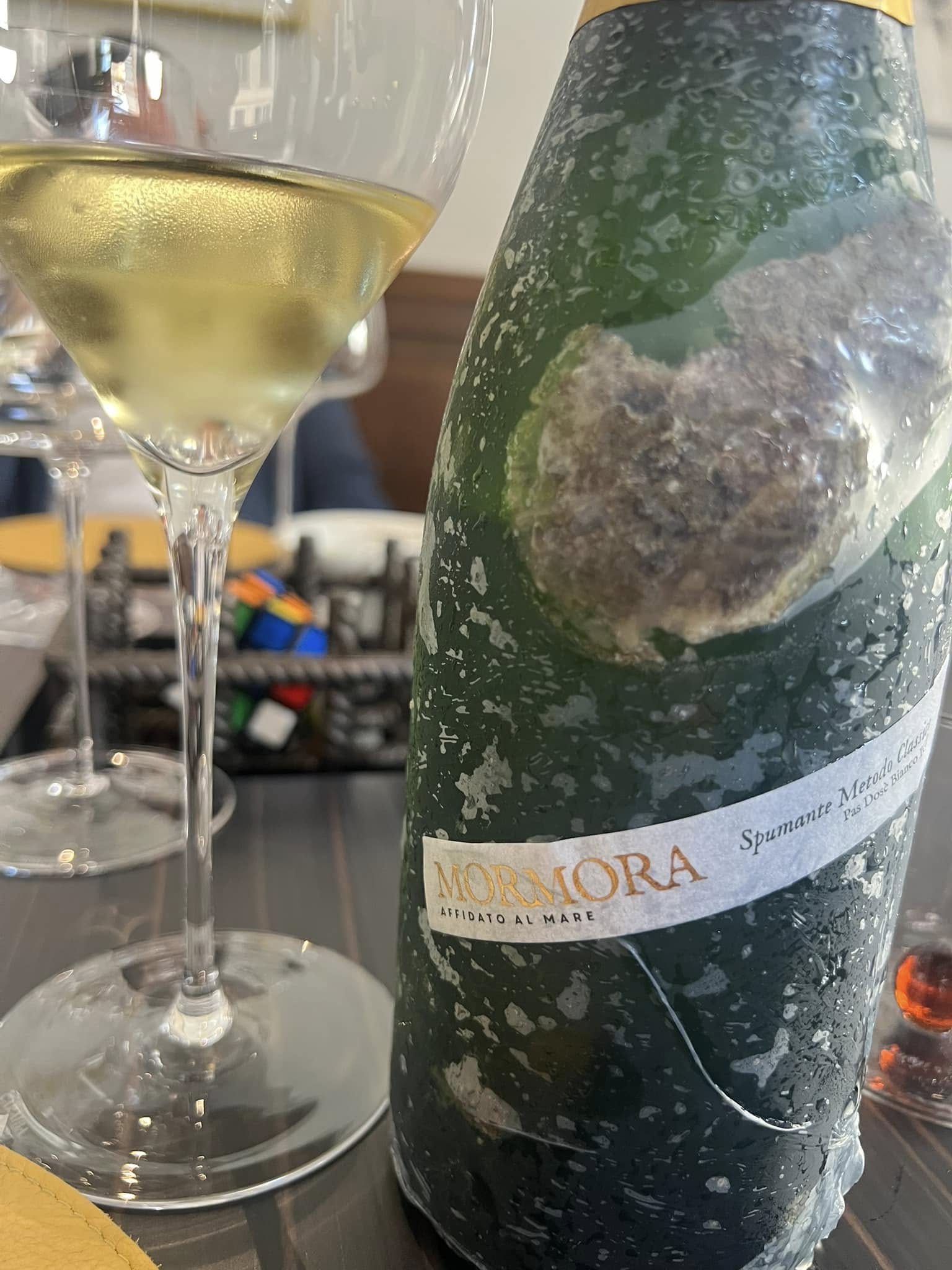 C’è chi dice che mettere ad affinare gli spumanti in fondo al mare sia solo una trovata pubblicitaria. Può essere ma noi, siamo al terzo assaggio, una differenza la troviamo comunque: le bottiglie in fondo al mare sono più pronte da bere, forse a causa del movimento continuo che le correnti dei fondali imprimono alle bottiglie. E’ stato il caso dello Spumante Metodo Classico con affinamento di due anni sui lieviti messo in fondo al mare di Porto Cesareo presentato dall’azienda Paolo Leo da Pipero al Roma: nel bicchiere lo prova è stata davvero interessante, grande sentore agrumato, citrico per la precisione, bollicina fine ed elegante, sorso lungo e appagante, decisamente efficacia sulla mitologica carbonara del locale romano. L’audacia di sperimentare con due vitigni locali considerati minori, verdeca e maresco (che non conoscevo), è stata decisamente premiata dal risultato: mille bottiglie al top.