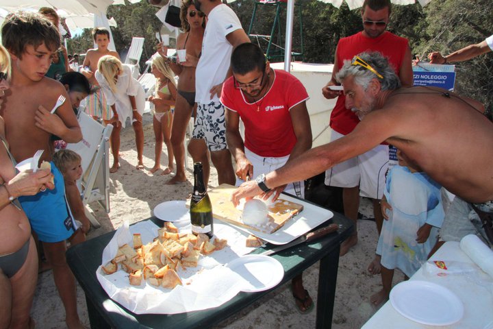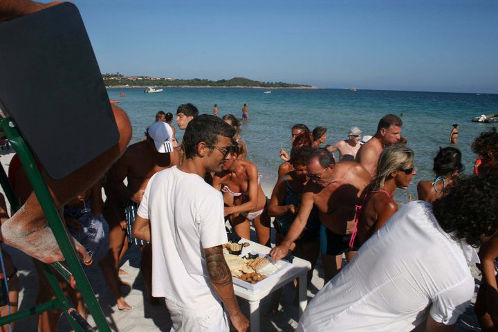 Mozzarella party annunciato da più giorni alla spiaggia Peripetia, dove Gianni Manfredi, Jean de la Plage per gli amici, ha ancora una volta allestito tavola e rifornito di bevande (un indovinato Torbato ben ghiacciato) e salumi sardi per fare da corona a sua maestà la Bufala. Sebbene per chi scrive sia poco commendevole, in quanto giornalista, l’associazione con il bovino nostrano, è di grande soddisfazione fare le capriole in qualità di anfitrione fra produttori e corrieri per vedere mani e bocche di ogni parte d’Italia – e non mancano facoltosi italiani all’estero – affondarsi e riempirsi nella pasta filata grondante di latte. Basti dire che c’è chi ha abbreviato la giornata in barca o in gommone per non mancare all’appuntamento pomeridiano con la mozzarella…