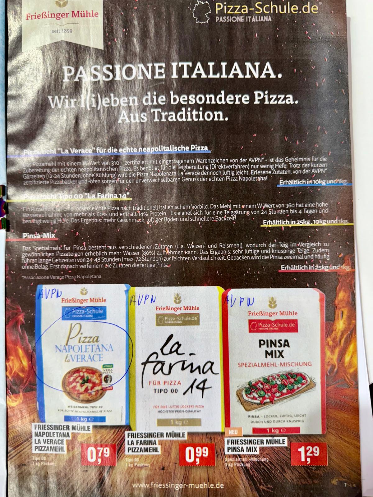 Gira per wa questa foto: si tratta di una pagina pubblicitaria di un produttore tedesco di farina. Cosa salta agli occhi? Questo: che la farina per pizza napoletana tradizionale costa meno degli altri tipi, persino di quella per la pinsa che è tutto sommato qualcosa di assolutamente recente dal punto di vista commerciale, per non parlare dal punto di vista storico.