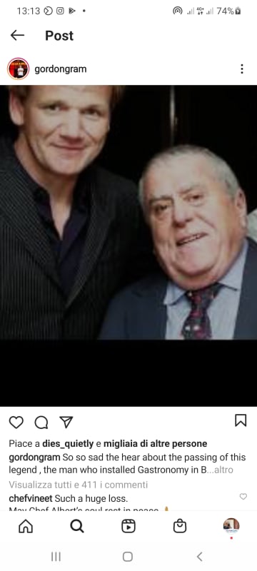 Il ricordo di Gordon Ramsey attraverso il suo instagram: “Così triste sentire la morte di questa leggenda, l’uomo che ha portato l’alta gastronomia in Gran Bretagna, abbiamo condiviso lo stesso ufficio negli ultimi dieci anni e salire quelle scale oggi sarà davvero difficile, grazie Albert per tutto ciò che hai mi ha dato. Dio ti benedica Chef