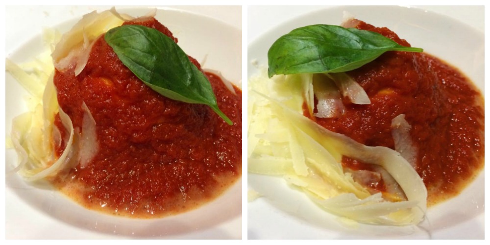 Si parte con la tradizione. Pura e semplice. La Parmigiana Di Mozzarella Di Bufala by Muu. Un piatto intenso ed emozionale. La forma di un tortino o di un flan, la sostanza ed il sapore della parmigiana della nonna. Corsi e ricorsi storici. Curve nella memoria del gusto. Il tutto reso un po’ più vibrante da una chiffonade di Parmigiano Reggiano 24 mesi, tocco ruffiano, estetico e gradevole dello chef. Impiattamento esteticamente appagante.