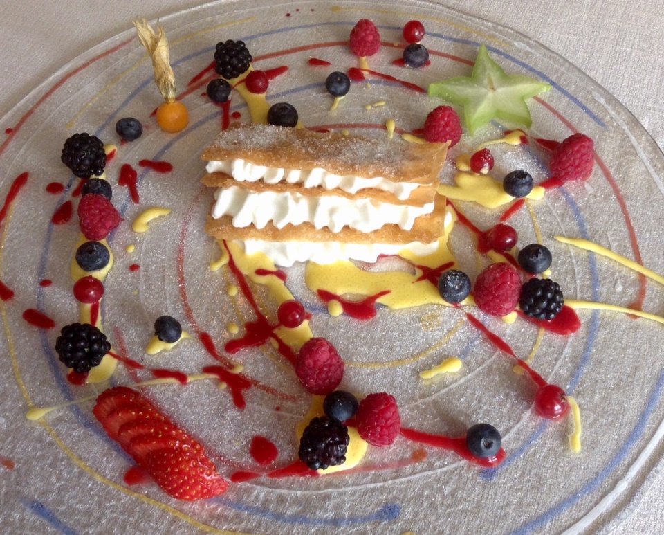 Nadia, Erbusco, millefoglie con spuma di yogurt e frutti rossi, un grande fine pasto per freschezza, dolcezza, acidità, leggerezza, digeribilità e resettaggio palato.