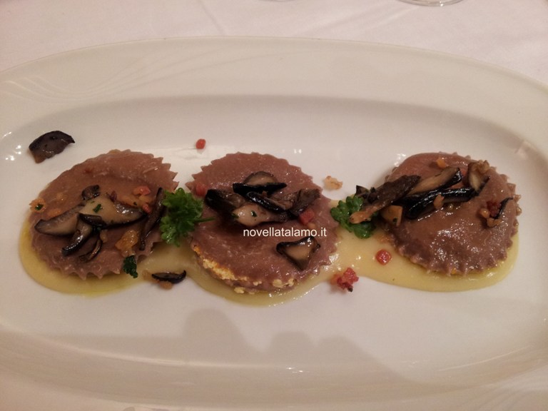 il primo di Tommaso Morone: ravioli di grano arso con zucca e caprino, crema di patate al timo e cardoncelli croccanti