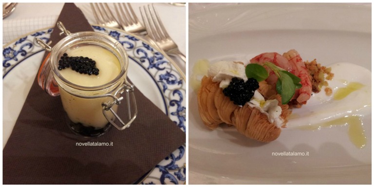 Affidata a lui l’apertura della cena con cappuccio di seppia in vasetto e sfogliatella aperta al fior di ricotta di bufala con crudo di gambero rosso al lime, su acqua cetata Cilentana e caviale mujol, piatto abbinato allo Chardonnay 2011 di Fabrizio Bianchi, Chardonnay in purezza di colore giallo paglierino, con note di frutta gialla, ananas e pesca al naso e buona freschezza e sapidità al gusto.