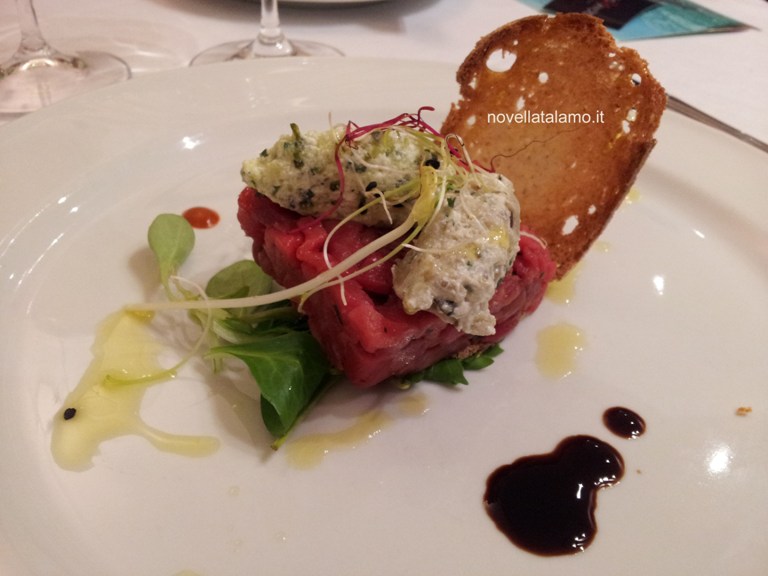 l’antipasto di Tommaso Morone: tartara di fassona con quenelle di melanzane e zucchine e veletta di pane con dressing di peperone crusco e ristretto al balsamico