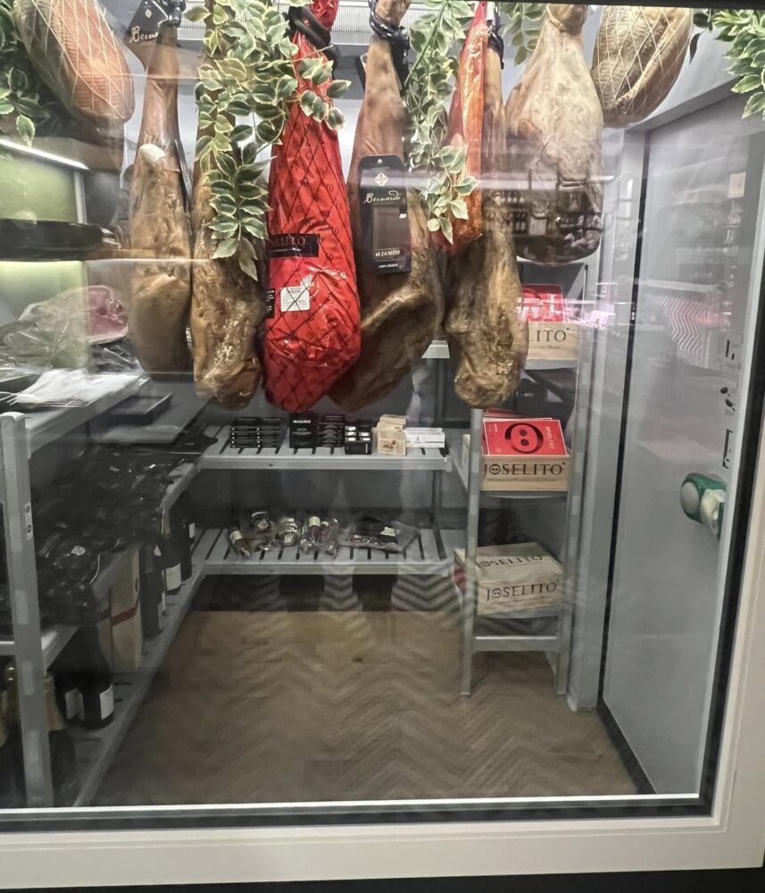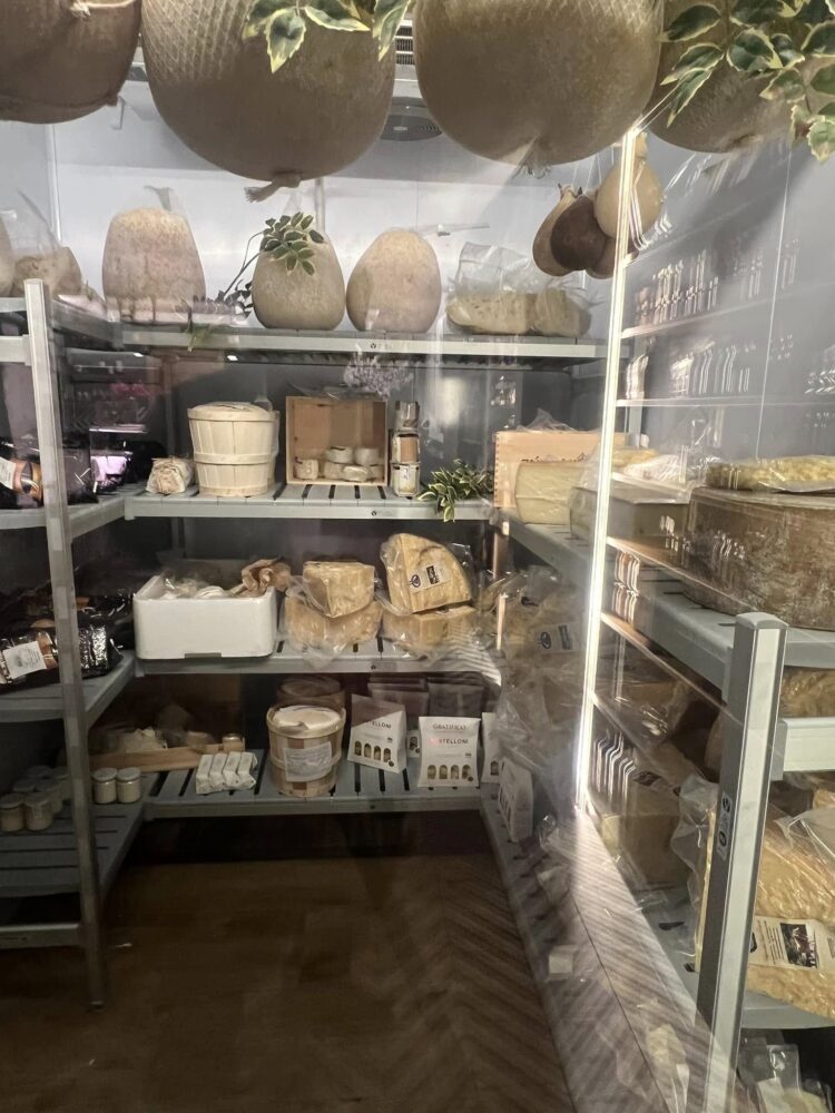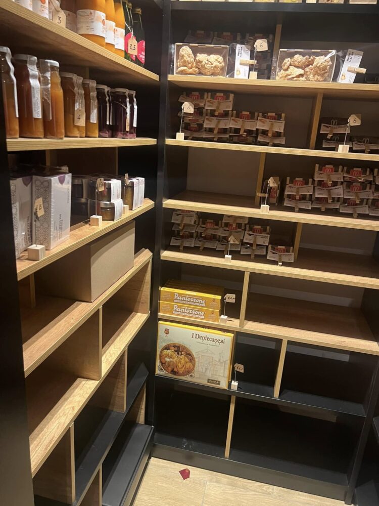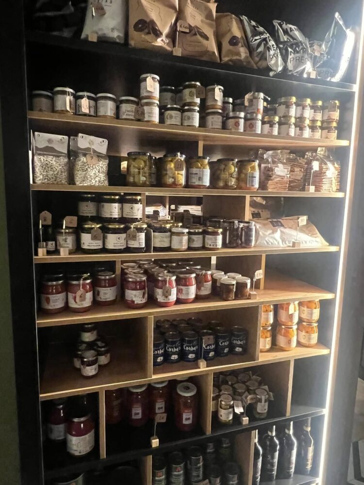 In questo spazio ben organizzato abbianmo la cantina, un tavolo imperiale da 14 posti da utilizzare per il laboratorio (Abraxlab o Labraxas? Il discorso resta aperto) o una cena riservata, belle conserve di legumi, ortaggi, frutta e pomodori, succhi di frutta, formaggi, pasta artigianale, alici del Cantabrico, salumi e prosciutti, olio d’oliva e dolciumi. Insomma di tutto e di più. d