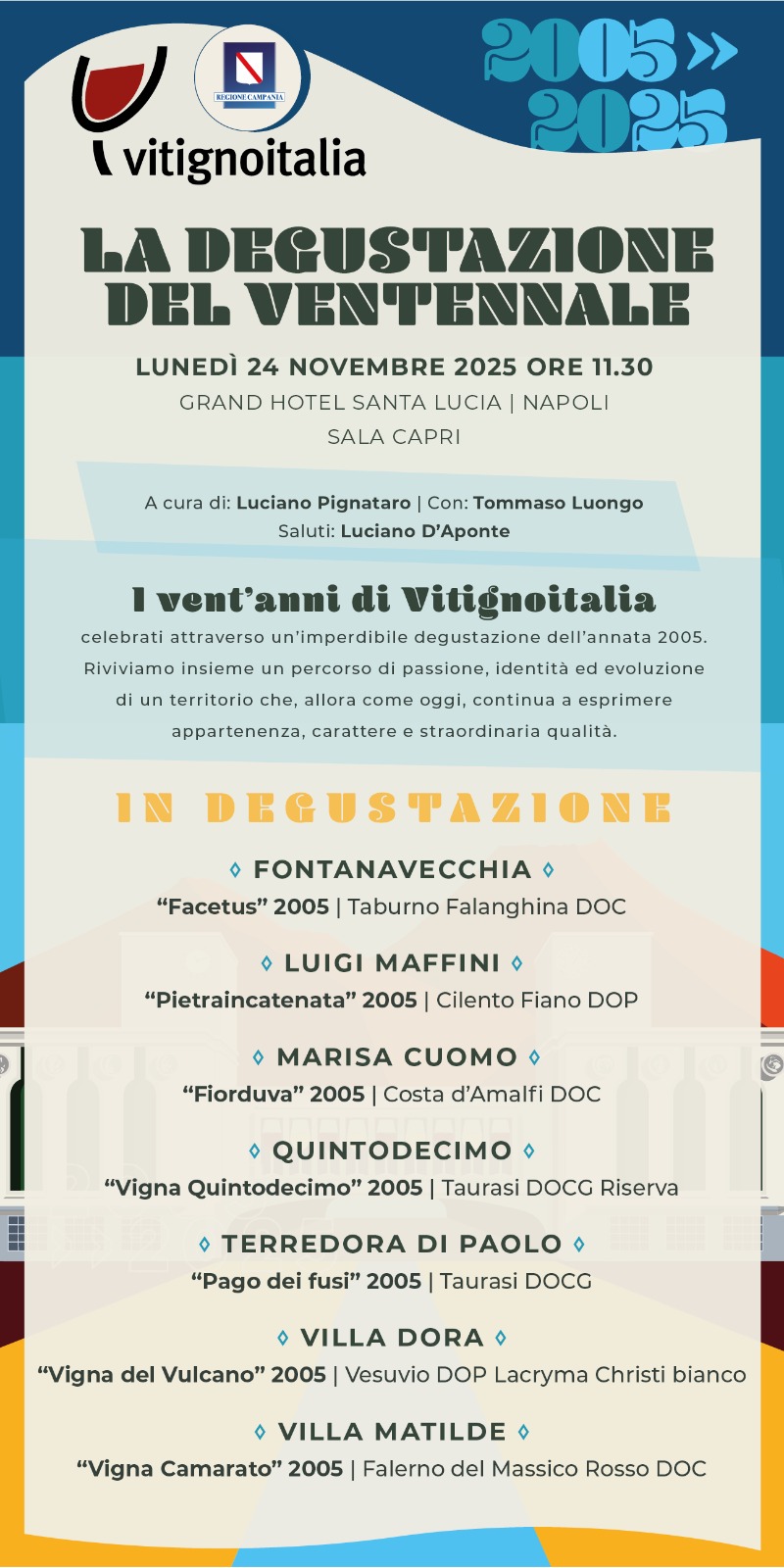 Ed è proprio a stampa e operatori che è dedicato il primo appuntamento della giornata di lunedì, ospitato nelle eleganti sale del Grand Hotel Santa Lucia di Napoli in Via Partenope 46 dalle ore 11.30. La degustazione del ventennale, una masterclass speciale (esclusivamente su invito) per celebrare i vent’anni della manifestazione attraverso una selezione delle migliori etichette campane dell’annata 2005. Un excursus tra i territori e i vitigni più identitari dell’enologia regionale dal Taburno con la Falanghina “Facetus” di Fontanavecchia, arrivando poi in Cilento con “Pietraincatenata” di Luigi Maffini, una delle espressioni più mediterranee e luminose del Fiano, per poi risalire la costa con Marisa Cuomo e il suo “Fiorduva”, un inno alla ricchezza enologica della Costiera Amalfitana. E ancora: scoprire il Taurasi tra la Riserva “Vigna Quintodecimo” della cantina Quintodecimo e il “Pago dei fusi” di Terredora di Paolo, per poi arrivare sulle pendici del Vesuvio con “Vigna del Vulcano”, il Lacryma Christi bianco di Villa Dora fino al cuore del casertano con il “Vigna Camarato”, il Falerno del Massico Rosso di Villa Matilde. Un cammino nel tempo e nel territorio che, attraverso le voci esperte di Luciano Pignataro, Tommaso Luongo e Luciano D’Aponte, permetterà di ripercorrere l’evoluzione dell’enologia campana attraverso un’annata che, a distanza di vent’anni, continua a raccontare una storia di forza, carattere e straordinaria qualità enologica.