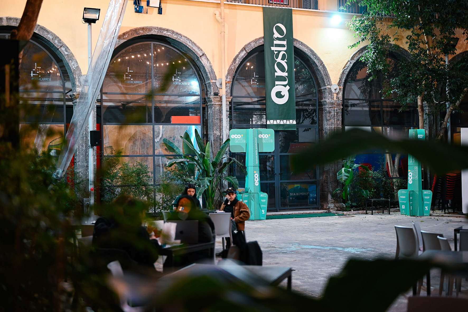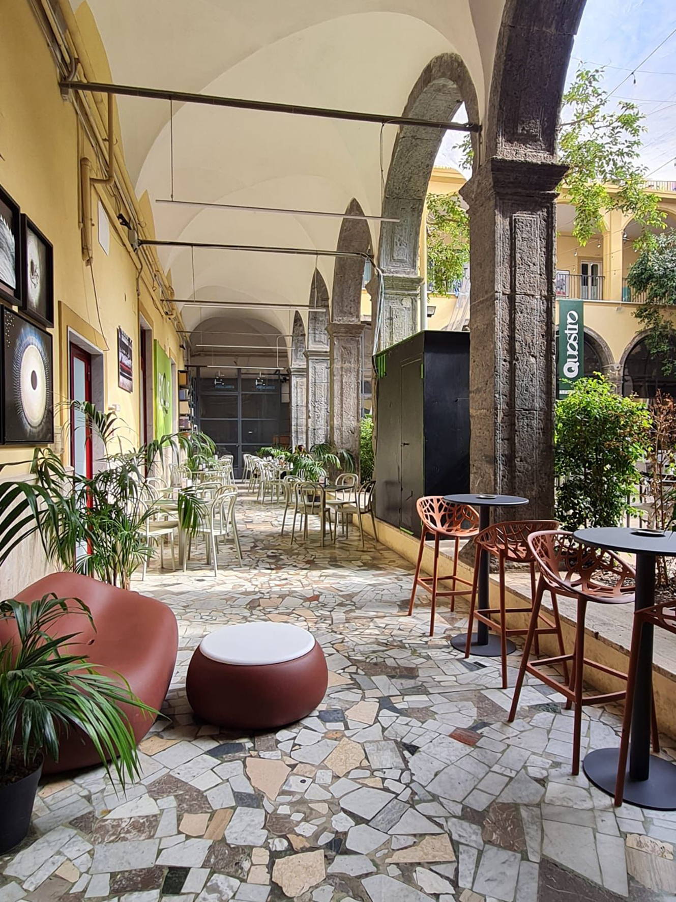 Il bistrot Quostro, nel vicolo dedicato a Totò nel cuore della Napoli più pop e verace, ha da poco completato anche l’opera di restyling di cui il progetto di ristrutturazione guidato dall’Architetto Salvatore Cozzolino. Arredi semplici che perfettamente si integrano negli spazi della corte cinquecentesca e sotto l’ampio e luminoso porticato; tavolini in ferro battuto con sedie coordinate provenienti da un’azienda spagnola, sgabelli color terra e gumble sofà donano movimento allo spazio. La mise en place è semplice e funzionale e in perfetto stile Quostro. Il menù segue il corso delle stagioni e lo chef Francesco Frascione con la sua impeccabile brigata, studia e mette a punto proposte buone, sane ed accessibili anche in termini economici. Quostro è il luogo ideale per una colazione dolce e salata, per una pausa pranzo, un aperitivo o anche solo per un caffè. Libri alle pareti, opere disseminate qua e là, i suoni di una città sempre in movimento e l’atmosfera rarefatta di una corte, rendono la pausa un momento unico.