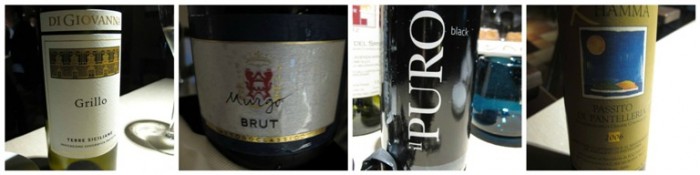 Cantina San Teodoro, i vini: il Grillo di Di Giovanna, lo Spumante Metodo Classico Murgo, Il Puro black di Villa Lupara e il Passito di Pantelleria Khamma 2006 di Salvatore Murana