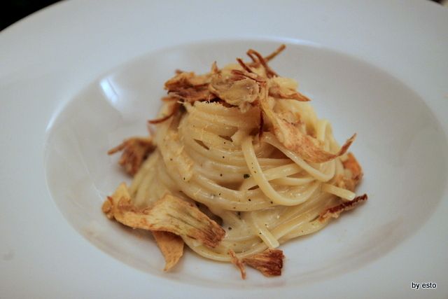 Deciso e sapido per il pecorino romano e per la scelta della linguina questo “mangiamaccheroni” con carciofo croccante. Anche qui aleggiano il ricordo del Maestro del cuoco e la sua rilettura d’ O ddoje allattante.