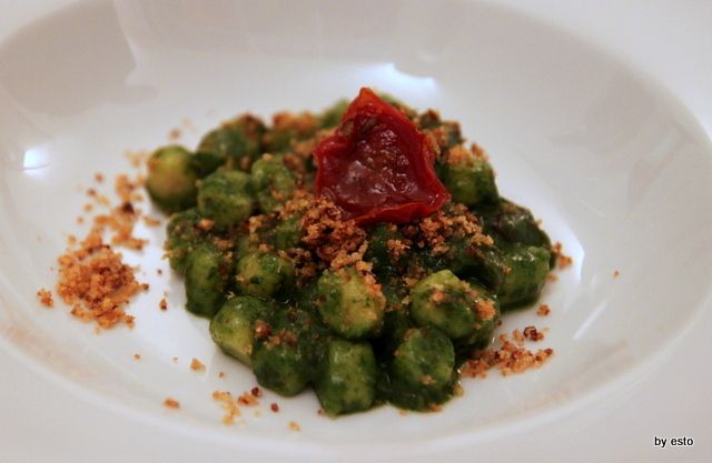 E’ ceniero ceniero, si scioglie in bocca e non si appiccica. E’ gustoso per la sapiente mantecatura con la vellutata di friariello verde brillante, amara e piccantina. Fresco è il pomodoro appassito e valido è il crunch della mollica di pane fritta con gli aromi. Vivida è la traccia della colatura.