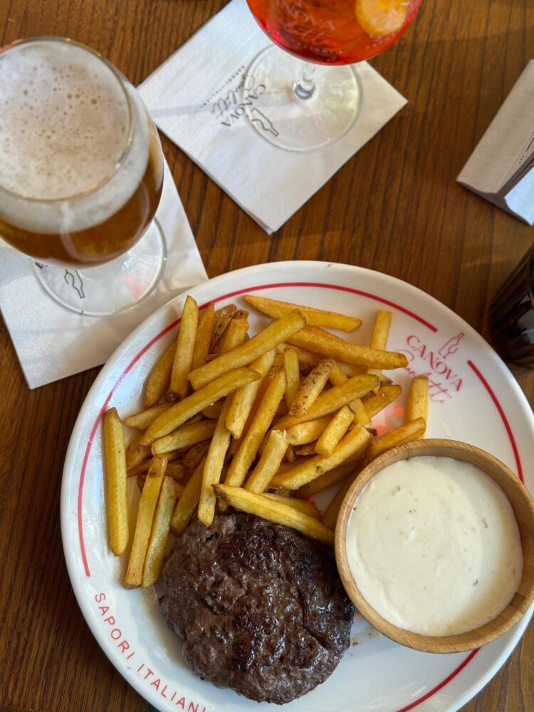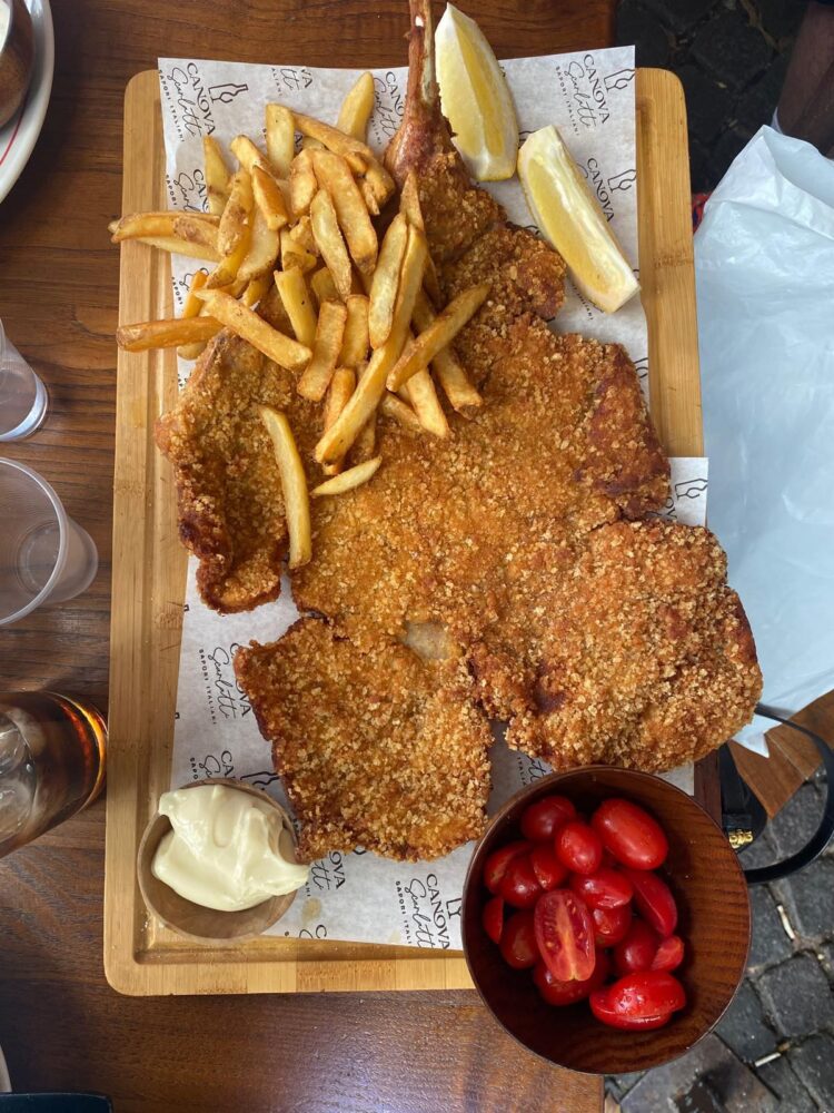 La cotoletta milanese orecchio d’elefante in salsa napoletana. La versione partenopea – cotoletta di suino da 600 grammi con patate, pomodorini e mayo – sta spopolando da Canova Scarlatti nel cuore del Vomero, a Napoli. Tra social, condivisioni di clienti, reels con personaggi del web la maxi cotoletta con l’osso e panatura panko è il piatto più “instagrammato” del locale, come racconta Vincenzo Russo, lo chef imprenditore che accoglie i clienti sempre con il sorriso.