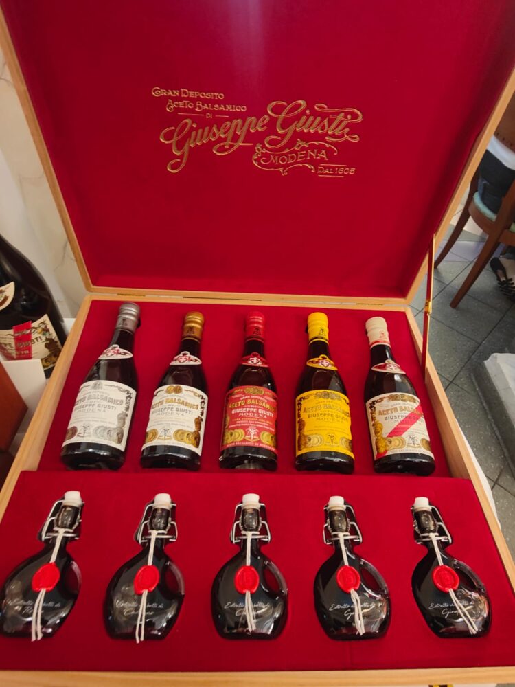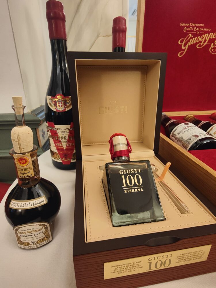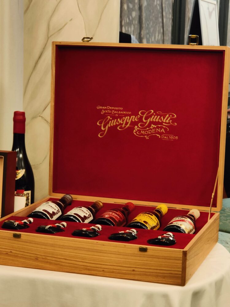 La famiglia Giusti crea quindi lo Scrigno, un pregiato cofanetto in legno contenente l’intera Collezione Storica nel classico formato Champagnotta, in abbinamento a cinque pregiati Aceti Balsamici invecchiati in singole botti di Rovere, Ciliegio, Castagno, Gelso e Frassino. In esposizione anche la Riserva e il Vermouth che come le altre tipologie di aceto è stato provato accostandolo alle portate di chef Giugliano.