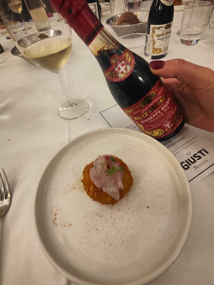 Dalla caprese con tartare di gambero al peperone ‘mbuttunato, senza dimenticare i taco bao alla genovese, il crocchè di patate con crudo di spigola, alici provola e zucchine alla scapece, e gli ziti “allardiati” tutto è stato accompagnato dall’aceto balsamico di Modena Giusti, persino il babà con crema pasticciera e percoche.