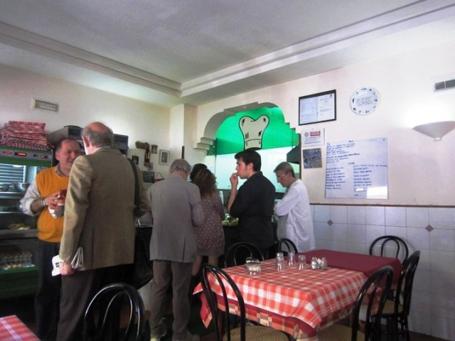 Questo ritrovo è un po’ come il bar del quartiere, tutti si conoscono o, si conosceranno visto che vengono qua ogni giorno. Sono medici, personale dei vicini ospedali, impiegati di banca, rappresentanti, commercianti, qualche studente, operai che lavorano in zona, coppie anziane che non hanno voglia di cucinare a casa, insomma un po’ di tutto. La cucina, a parte i fuochi professionali, assomiglia a quella di casa, pensili e mensole, piastrelle bianche con qualche decoro. Salvatore è praticamente un fulmine tra cucina, sala, e organizzazione degli ordini da asporto, quelli delle persone in fila e quelli che arrivano per telefono.