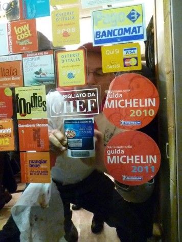 Ieri sera l’ho guardata per un pò la porta e ho contato gli adesivi delle guide nelle quali, di edizione in edizione, è recensito. Ho sorriso pensando a quel che poco dopo avrei fatto. Poi la porta si è aperta e Enzo ha mollato agli astanti qualche piatto di pizza da assaggiare nell’attesa. Uno spicchio per uno, il buonumore è tornato e la voglia d’entrare è raddoppiata.