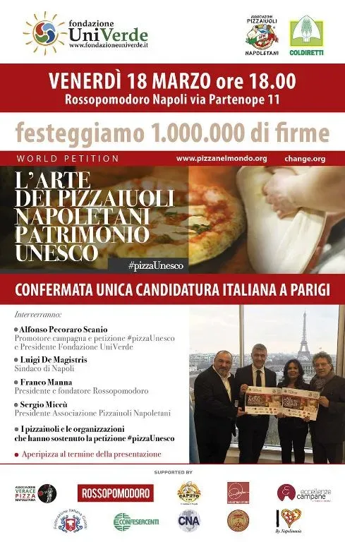 Un milione di firme per la pizza come Patrimonio Unesco: la festa da Rossopomodoro 17/3/2016 Torna a: Napoli, 18 marzo. Un milione di firme per la pizza come Patrimonio Unesco: la festa da Rossopomodoro Un milione di firme per la pizza come Patrimonio Unesco: la festa da Rossopomodoro