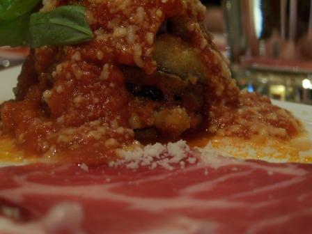 Assaggiamo questo sugo sulla millefoglie di melanzana. Nel piatto anche dei buoni salumi affettati.