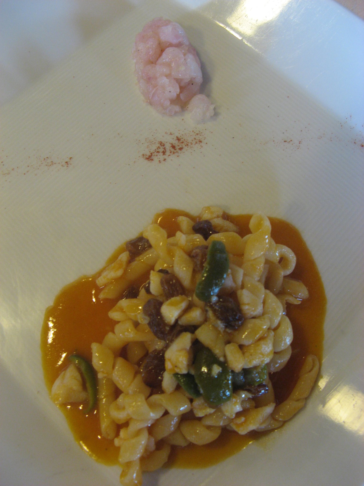 La Cantinella. Fusilli al ferretto con ragù di scorfano, tartare di scorfano e zenzero, pinoli, uvetta e olive verdi