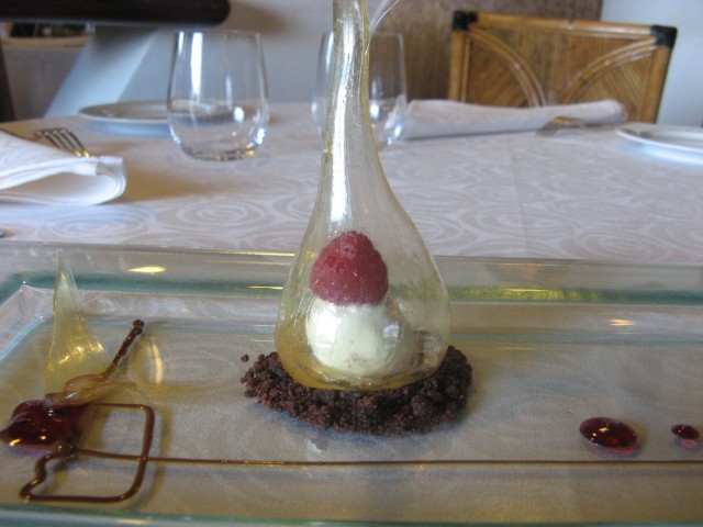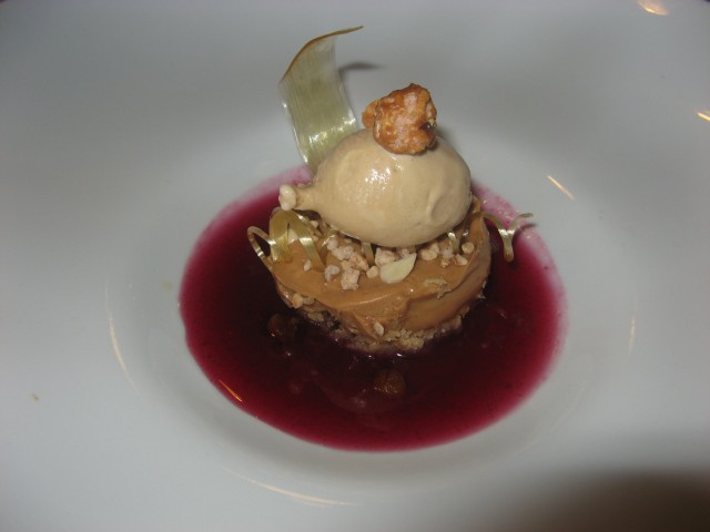 La Cantinella. Zuppetta di frutti rossi e aceto di Xeres con Pan di Spagna alle nocciole, mousse di nocciola, gelato di fave tonka e nocciole caramellate