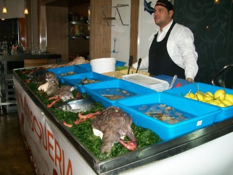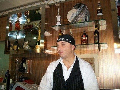 Monica saluta sorridente e Gennaro dietro al banco si lascia fotografare; è curioso, l’impressione è di stare in un ambiente familiare ma differente; il menù del giorno offre gnocchetti alla Luciana (per chi non è napoletano, con polpi affogati in casseruola: il nome proviene da Santa Lucia quartiere di Napoli noto per canzoni e borgo marinaro), insalata di mare, filetto di spigola (=branzino) all’acqua pazza, frutta e dessert. No, io voglio il piatto crudo con scampi, gamberoni, coroniello e tartare di pesce spada, l’alternativa è l’affumicato con baccalà, salmone, pesce spada e tonno, oppure il piatto marinato di alici, salmone, pesce spada e spigola di mare.