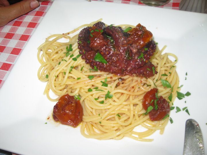 La pasta viene da uno dei migliori pastifici di Gragnano, l’olio extravergine arriva direttamente da un frantoio pugliese, e si sente, eccome se si sente.J Antonio e famiglia sono molto attenti alla qualità del prodotto, ma, anche al rapporto prezzo/qualità: ad esempio un’abbondante porzione di veri paccheri di Gragnano con spada e melanzane vi costerà 10 euro. Non potevano mancare stocco e baccalà, spugnati benissimo, e preparati nei modi tradizionali: in bianco con le olive, fritto, in cassuola o arrosto, al forno con le patate o, con i ceci. Il menù, l’avrete capito, non esiste, la Pignasecca è un mercato a cielo aperto, appena serve qualcosa si esce e si compra, senza accumulare mai nulla, nel rispetto della sana filosofia partenopea: “’ccà è comm’ ce scetammo’ ‘a matìna”. Se, poi serve qualcosa si esce un momento e si compra. In media si preparano sei o sette tipi di primi e sette, otto secondi. Il resto, soprattutto i piatti di pesce e verdure, si preparano al momento secondo le richieste dei clienti, prenotati o estemporanei.