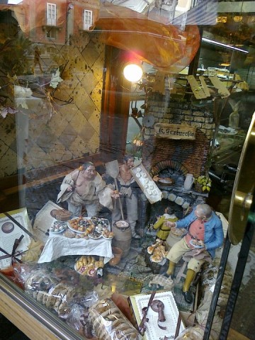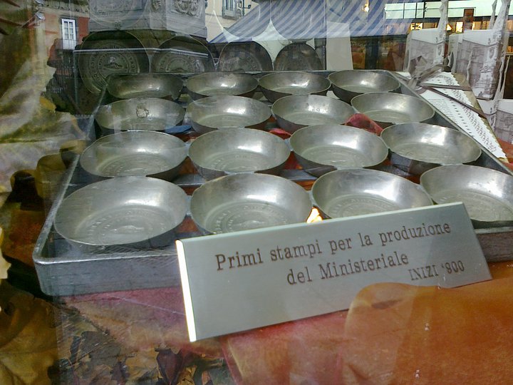 In vetrina una bellissima scena presepiale, con una riproduzione molto raffinata di un banco dei dolci e, più sopra, gli stampi nei quali si facevano i famosi “Ministeriali”, medaglioni di cioccolato dal ripieno cremoso, dolcissima invenzione brevettata da quasi cento anni e venduta oggi in tutto il mondo anche grazie ad un packaging accattivante.