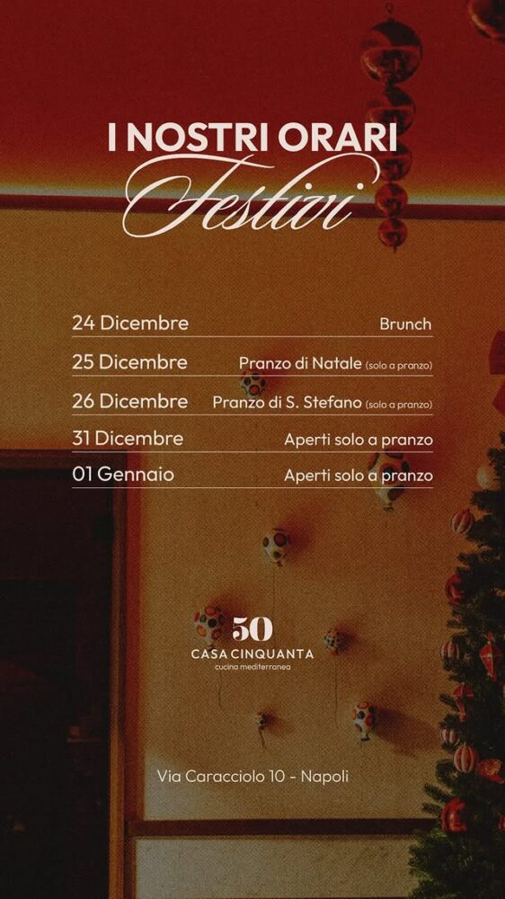 Il 26 c’è il Pranzo di Santo Stefano, il 31 dicembre e i 1° gennaio apertura solo a pranzo – per conoscere anticipazioni sulle portate, consultate il profilo instagram @casa50ristorante sempre ben aggiornato.