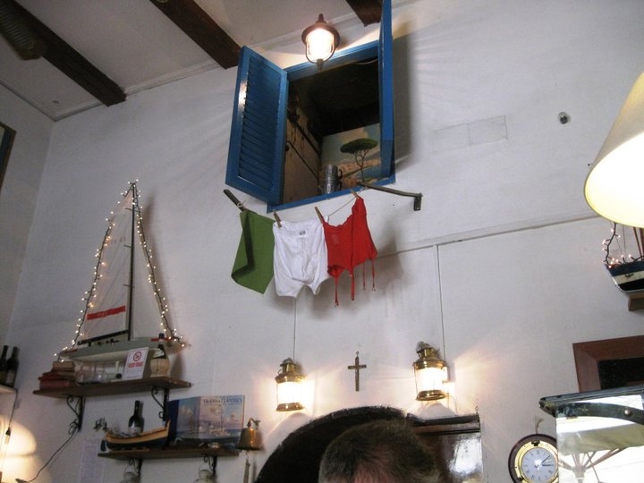 Intanto mi guardo intorno: arredamento curato, tovaglie da ristorante, in tinta unica con tanto di coprimacchia, stavolta niente quadretti. Alle pareti c’è davvero di tutto: in particolare modelli in legno di imbarcazioni a vela di vario tipo ed epoca, strumentazione di bordo, bandiere, stemmi, remi in legno, lampade, scaffali con tanti vecchi libri e in alto, proprio sull’ingresso della cucina, mi colpisce una “fenestella” con le ante azzurre, classica degli ambienti marinari napoletani di una volta. Sul davanzale, una corda di panni stesi molto particolare…guardo bene: è un tricolore, composto da biancheria intima femminile di larga taglia, sfrenata fantasia partenopea. Prima di andar via scoprirò il perché… per ora, mi accontento di sapere che la finestra è finta, frutto dei lavori durante la trasformazione del locale da american bar in osteria familiare.