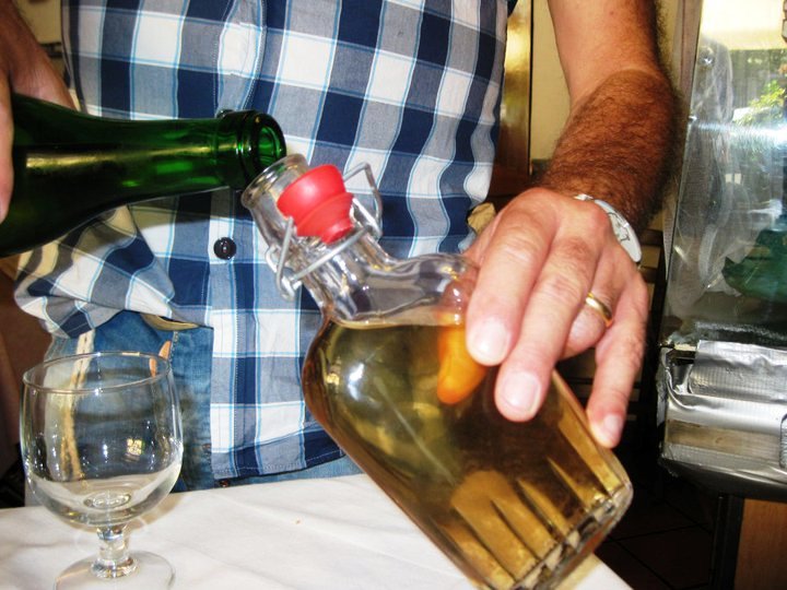 Sugli scaffali noto bottiglie di vino campano dalla faccia conosciuta, le etichette più note anche all’estero, il che dimostra che il nostro Oste ha una buona conoscenza dei gusti della propria clientela. Il vino della casa arriva da un noto distributore di città: falanghina, probabilmente del beneventano e piedirosso flegreo. La maniera di offrire il vino sfuso è molto simpatica: Antonio, Andrea, o l’aiuto di sala portano in tavola una fiaschetta in vetro con il tappo stile “idrolitina”, dove, da una bottiglia più grande versano il vino richiesto. I bicchieri sono i classici da osteria, ma, per i vini imbottigliati ci sono i calici professionali.
