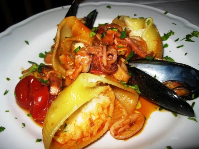 I profumi si fanno più intensi e accattivanti, iniziano ad uscire i primi piatti di mare, il fiore all’occhiello dell’osteria, in particolare due ricette reinterpretate da Antonio e richieste da tutti gli habitué napoletani e non, professionisti, bancari e gente comune, che, dopo una prima visita, si aggiunge automaticamente alla numerosa schiera degli aficionados. I piatti in questione: Conchiglioni, con appena un bollo, farciti di cozze, provola e ricottina fresca, infornati e poi conditi con sughetto di pomodorini del piennolo, polipetti o, piccoli calamari a pezzetti.