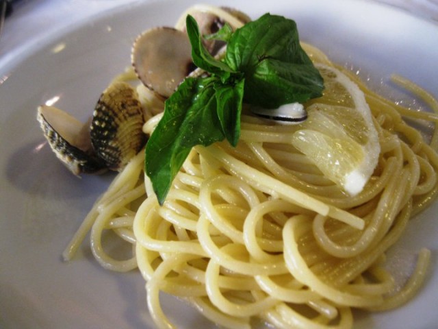 L’altro “must”: linguine, o, spaghetti, con telline e taratufi al profumo di limone e basilico, Un piatto delicato e saporito allo stesso tempo, dove sapidità, aromaticità, agrumato e tendenza dolce della pasta, creano una piacevole armonia. Stento a credere di trovarmi in osteria.