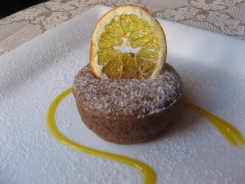 Cuocere in forno preriscaldato a 180° per 12 minuti, sformare in un piatto piano e nappare con una salsa di bucce d’arancia, precedentemente sbiancate ed emulsionate con un mixer con 50 gr di zucchero a velo.