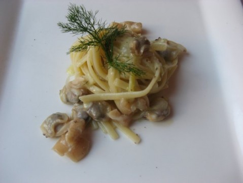 Linguine con cipollotto fresco, cicoli, tartufi di mare e finocchietto