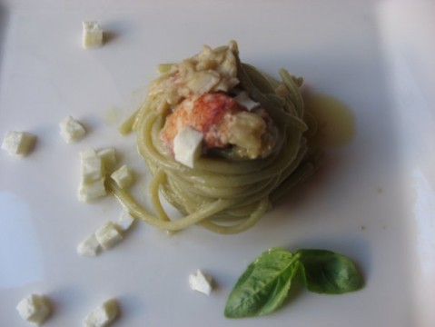 Cuocere l’ astice al forno / vapore a 65° per circa 10 minuti, raffreddare in acqua e ghiaccio, eliminare il carapace ed estrarre il frutto,e dalla testa ricavare il suo corallo, in una padella far soffriggere un spicchio d’aglio con l’astice e le chele preparati a tocchetti, far cuocere per tre minuti salare, pepare,e aggiungere del basilico.