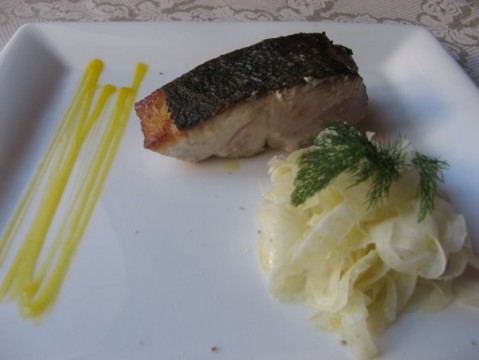 Trancio di ricciola scottata con insalatina di finocchio su salsa di arance