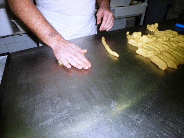 Il laboratorio è quasi a vista. Alle 8,00 arriva Monica, la fac totum , sorriso stampato sulle labbra. Sui volti di Alfredo, Mamma Rosaria e Monica leggo tanta fatica, ma soprattutto tanta passione e devozione per un mestiere difficile da tramandare. Si lavora tutto il giorno a ritmi cadenzati, l’attività di laboratorio termina verso le 17,00, quando Gennaro, dopo quasi 12 ore ininterrotte di lavoro, va a riposare, lasciando Monica e mamma Rosaria a guardia del forte.