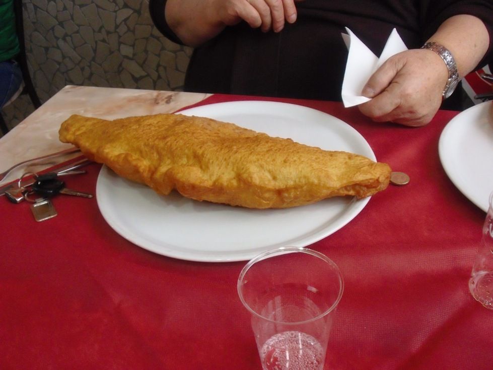 Prima di andar via ho chiesto alla simpatica signora del tavolo accanto di poter fotografare la sua fumante pizza fritta, e lei che ha accettato volentieri ci ha anche spiegato che il ripieno classico di cicoli, ricotta romana, pepe e provola di Sorrento è una bomba non di calorie ma di vero piacere! E se si volesse smussare il sapore la pizza fritta la si può ordinare ‘completa’ e cioè con l’ aggiunta di pomodoro passato! Curiose, l’assaggeremo!
