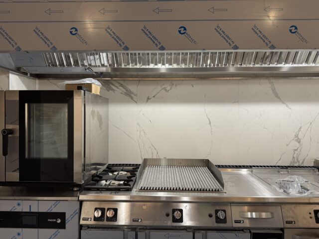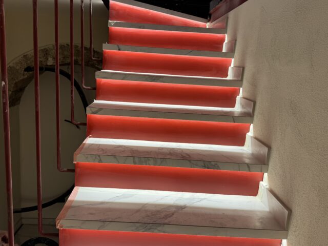 Iniziamo dalla ristrutturazione, con il locale che ha cambiato volto, ma non anima. Il restyling ha preservato e valorizzato elementi storici, come il marmo che percorre i muri del locale e le antiche maioliche che un tempo decoravano il pavimento e oggi rivestono parte delle pareti nel reparto pizzeria, e poi gli specchi. A dominare l’ambiente sono i toni caldi e un tocco deciso di rosso, colore che ritorna nel canale dell’aria condizionata a vista e nei dettagli luminosi dei gradini. I lampadari ricordano lo stile liberty e sono stati progettati esclusivamente per la nuova Gorizia 1916, mentre gli spazi sono stati rimodulati nell’arredo per accogliere al meglio sia la clientela storica sia chi cerca un’esperienza gastronomica completa nel locale iconico che ha accolto tra i tavoli personaggi illustri, come il principe Antonio De Curtis, cliente abituale, a cui è stata dedicata la pizza simbolo di Gorizia 1916. L’altro elemento importante è la cucina a vista, per dare trasparenza al progetto di valorizzazione della tradizione.