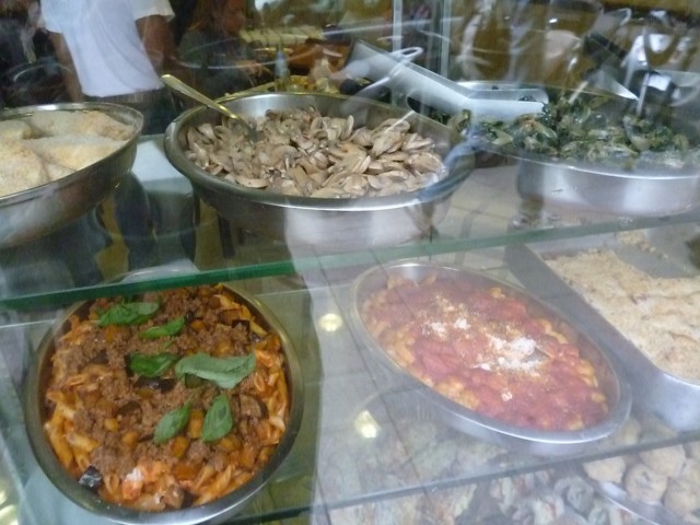 In una piccolissima sala che strizza l’occhio ai passanti da una vetrina zeppa di “ogni bene per golosi” (a seconda della stagione; zucchine “alla scapece”, parmigiana di melanzane, funghi trifolati, salsicce e “friarielli” e così via) ci sono sette tavoli, il bancone dove Raffaele impasta e forma le pizze dando sonori “schiaffoni” alla pasta, il forno e la cucina dove il personale frigge e “spadella” gomito a gomito.