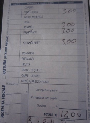 Il conto batte tutti i record del low cost: primo, secondo, contorno e vino della casa…€ 6,00, se aggiungiamo antipasto, secondo di pesce e dessert arriviamo a 12 euro. La colazione da asporto costa 3,00 euro. Acqua minerale, pane e coperto non si pagano.