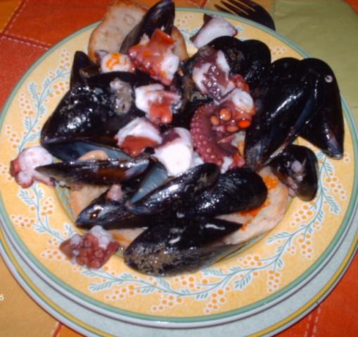 La vera zuppa di cozze, senza presunzione, continua Mattia, si mangia qua e in pochissimi altri posti a Napoli. La ricetta: cozze solo nostrane di stagione, fresella, polpo, olio piccante (‘o ‘rruss) e “maruzze” (lumache) di terra che si acquistano ovviamente al “buvero”. Le maruzze sono diverse a seconda delle stagioni e si servono a parte con l’olio piccante. La proverbiale ironia napoletana ha coniato nel tempo diversi proverbi con l’uso della parola maruzza: “Tenghe ‘e maruzzielle d’ ‘a festa, ca so’ meglie d’ ‘e cunfiette”( ho le lumachine della festa, che sono meglio dei confetti). Come significato traslato, “‘A Maruzza “ è sinonimo di vigliaccheria, ed anche di meraviglia e di un senso di paura fuori luogo, come nel detto : “Me pare Pulecenella spaventate d’ ‘e maruzze”, (SembraPulcinella spaventato nel vedere le lumache) quando sta ad indicare un marito fatto becco dalla moglie si dice: “Tene cchiù corna ‘e ‘nu cato ‘e maruzze” ( ha più corna di un secchio di maruzze). Riepilogando, ecco il menù di Titta e Mattia: antipasti di mare come sopra, oltre a frutti di mare cotti e crudi. Piatto misto di prosciutto crudo, pancetta tesa e provola. Ancora bruschette, zeppoline di mare con alghe vere e impasto di Titta. I primi di mare sono quelli tradizionali, spaghetti a vongole, ai frutti di mare e allo scoglio. I primi piatti quotidiani ci sono tutti. Pasta e cavoli, le paste con i legumi, pasta e zucca, pasta e patate con la provola, pasta al pomodoro, all’arrabbiata, o, alla puttanesca e poi quelli di lusso, genovese, ragù e bolognese.
