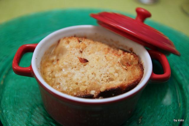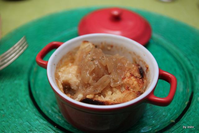 Nella piccola rossa cocotte una zuppa di cipolle ramate e bianche con il pane cafone e il caciocavallo.