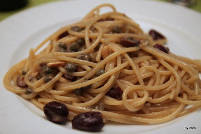 Vermicelli allo scammaro con Fiore Sardo Dop, Olive di Gaeta, Capperi di Pantelleria Igp, pinoli e alici.